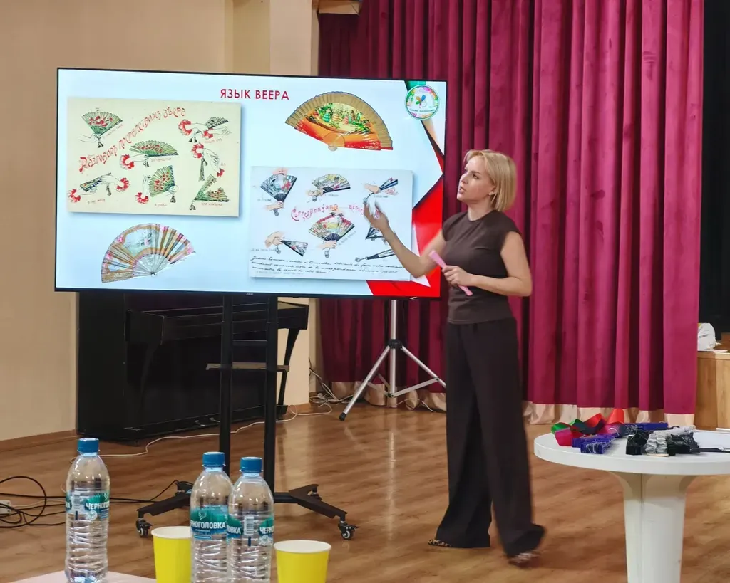Татьяна Денисова, хореограф Центра творчества перенесла нас в галантный век и продемонстрировала язык веера, разучив со зрителями танцевальную связку.